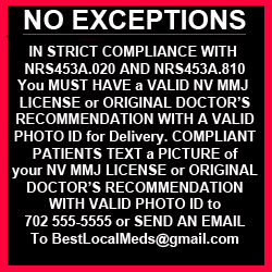 IN STRICT COMPLIANCE WITH NRS453A.020 AND NRS453A.810; You MUST HAVE a NV MMJ LICENSE or ORIGINAL DOCTOR'S RECOMMENDATION & VALID PHOTO ID for Delivery. COMPLIANT PATIENTS FOR FAST & EASY INSTRUCTIONS...